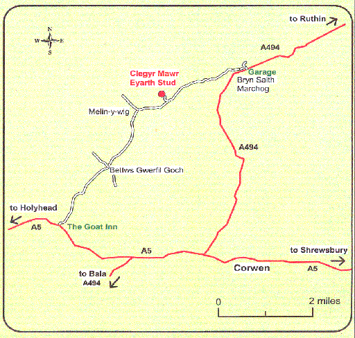 If you approach along the A5 from the east, you must drive through Corwen (about 10 miles beyond Llangollen), and on through two sets of traffic lights. Some 2 miles after the second set, you will come across a large pub, The Goat, on your right hand side. Leave the A5, turning right up a narrow road just beyond the pub car park. This takes you through the hamlet of Bettws Gwerfil Goch. Keep along this road, which will take you to a junction go right up the steep hill. Clegyr Mawr lies close to the foot of the next downhill section. The farm track is on the left hand side. The total distance from the Goat to Clegyr is 3.7 miles.